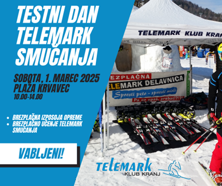 V soboto, 1. marca 2025, bo Telemark klub Kranj organiziral “testni dan telemark smučanja”. Za vse smučarje, ki bi se želeli preizkusiti v telemark smučanju, bo na voljo brezplačna izposoja opreme (smuči s telemark vezmi in telemark smučarski čevlji), prisotni pa bodo tudi učitelji telemark smučanja, ki vam bodo brezplačno pokazali osnove tehnike telemark smučanja. Našli jih boste na “Plaži” na Krvavcu, med 10. In 14. uro. Če si želite zagotoviti opremo, jim lahko pišete na info@telemarkklubkranj.si